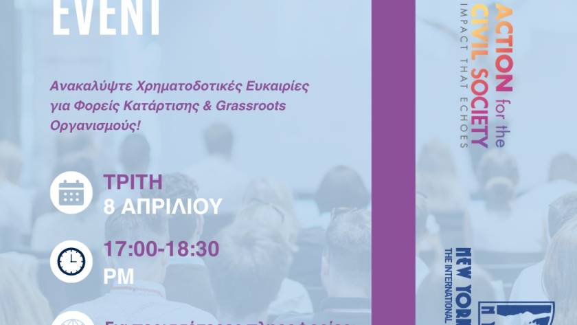 Η Action for Civil Society, σε συνεργασία με το New York College, σας προσκαλεί σε μια ανοιχτή ημερίδα δικτύωσης με τίτλο: «Ευρωπαϊκά Προγράμματα & Εκπαίδευση: Δυνατότητες, Χρηματοδοτήσεις & Συνεργασίες»